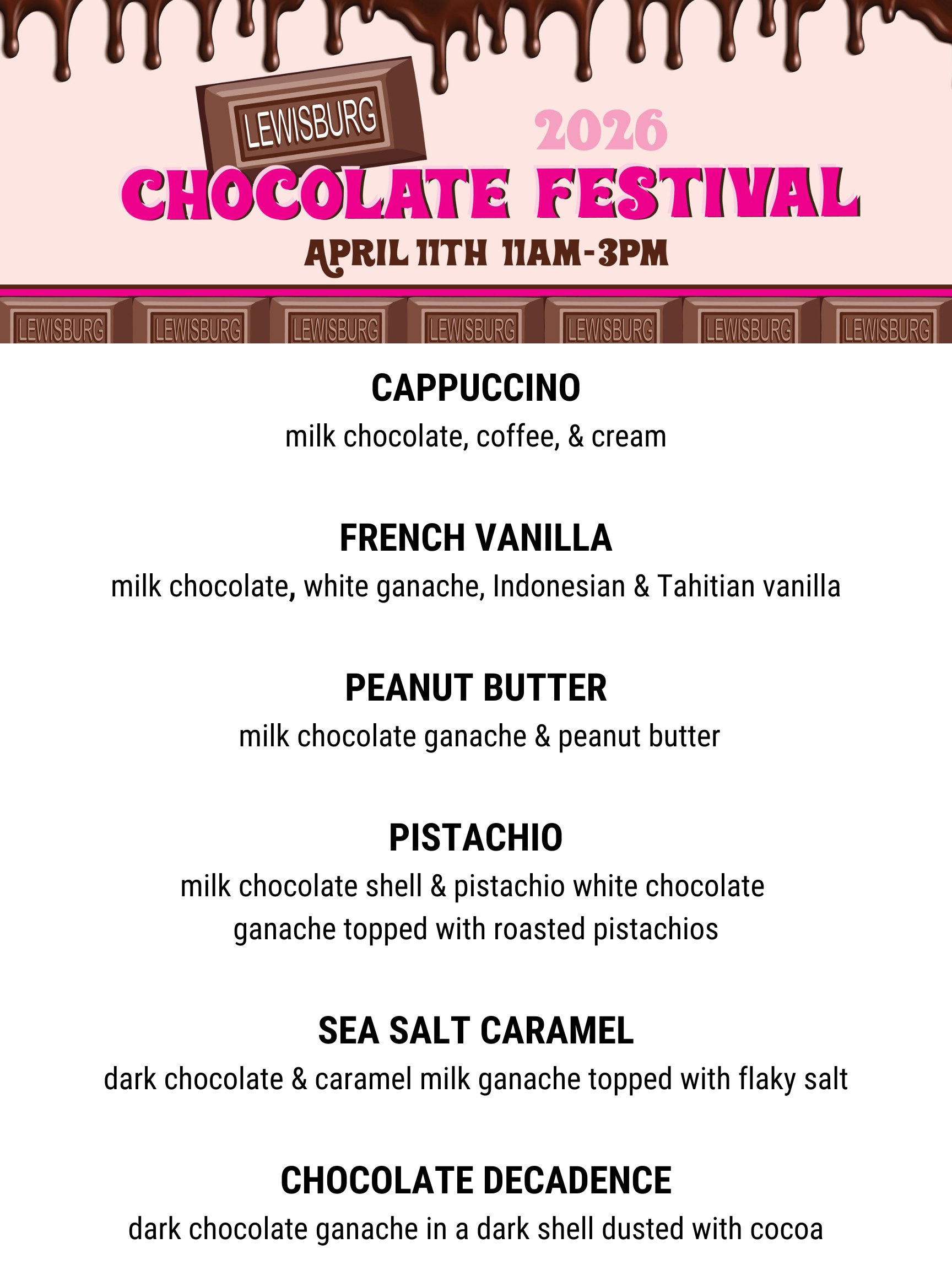 Join us during the Lewisburg Chocolate Festival and sample one of our featured tastings - cappuccino, French vanilla, peanut butter, pistachio, sea salt caramel, and chocolate decadence! The festival occurs one day a year and celebrates all things chocolate. (Tickets required)